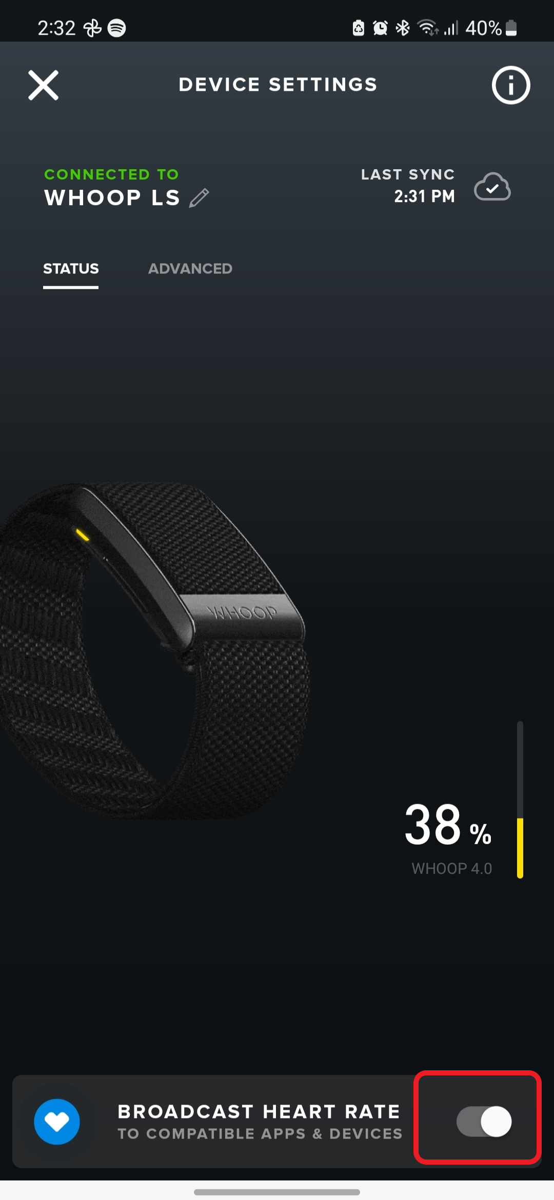 - Toggle on HR Broadcast to start broadcasting (See red box below) .